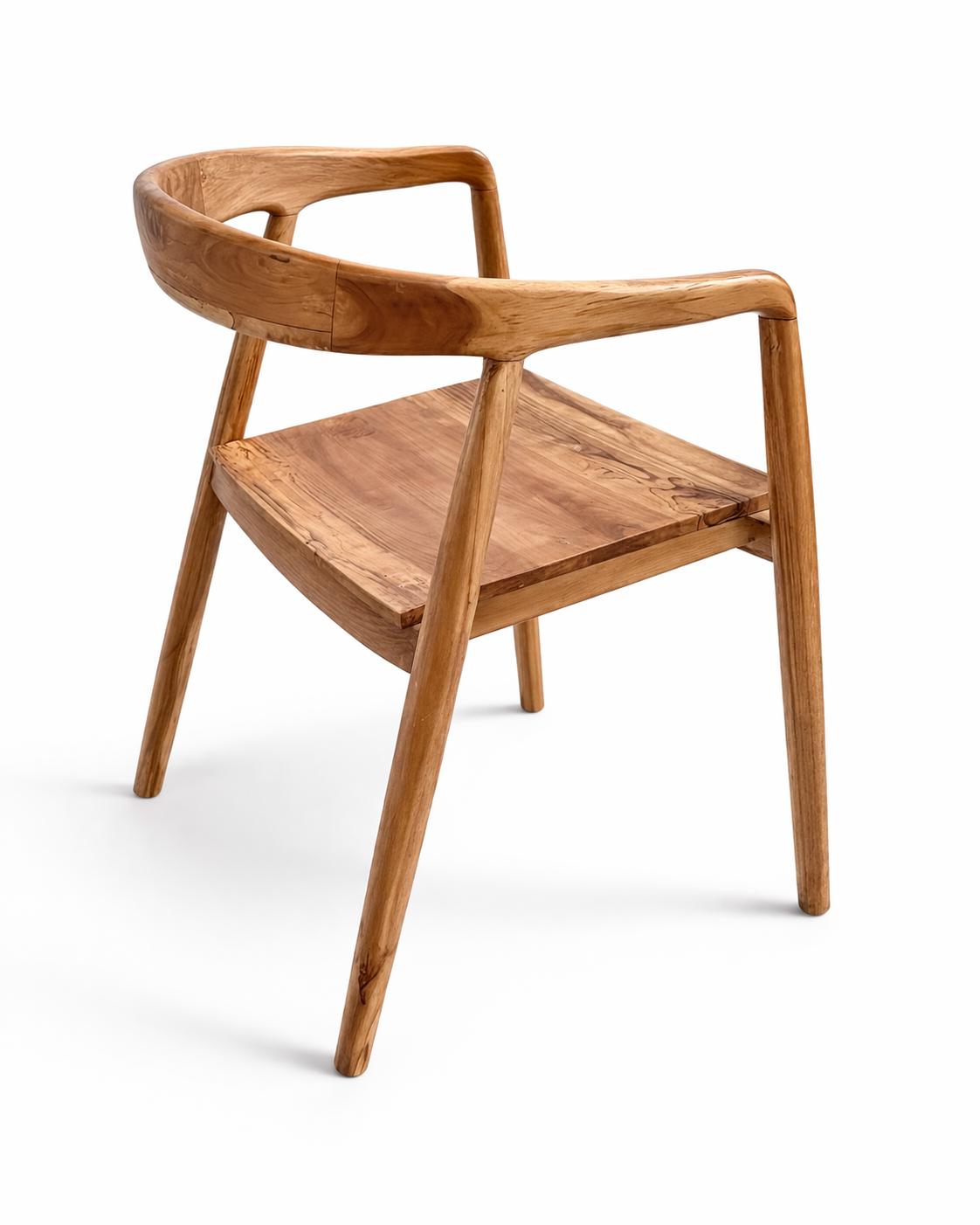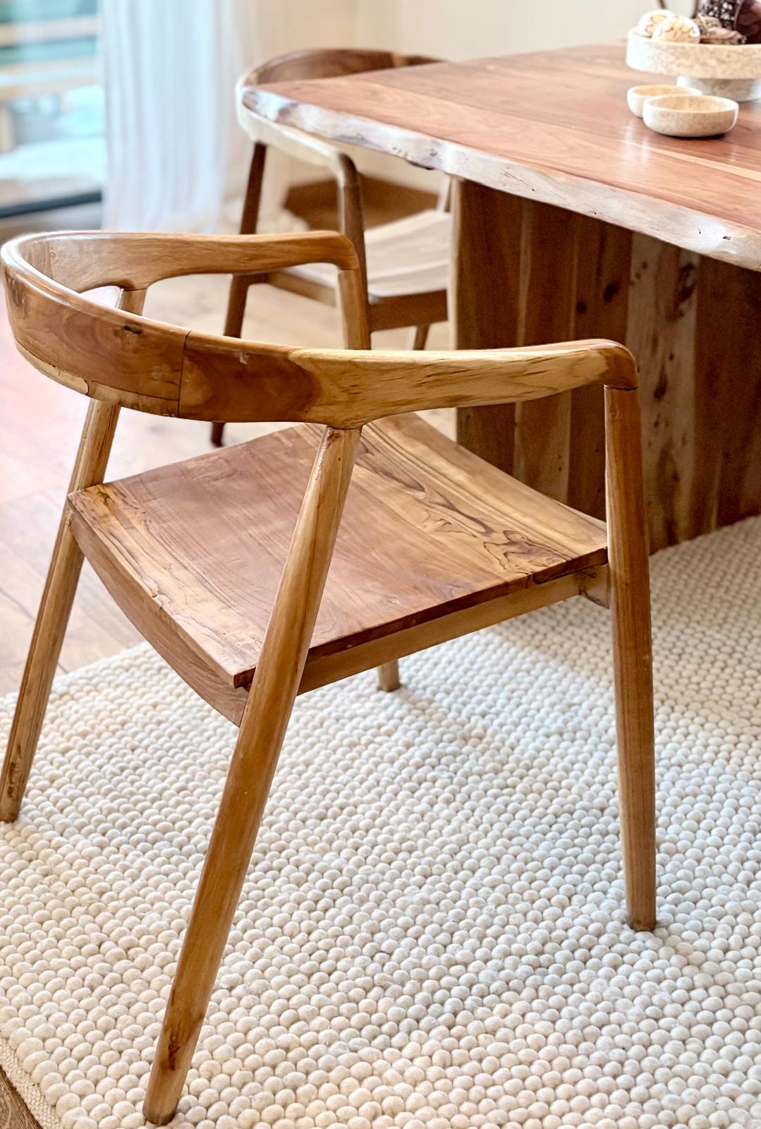 Krzesło zostało wykonane z drewna teakowego. Tek to drewno wyjątkowe — gęste, ciężkie i naturalnie odporne na wilgoć. Zawarte w nim oleje chronią je przed pękaniem, odkształceniami i upływem czasu. Drewno obrabiane jest ręcznie, bez pośpiechu, dzięki czemu zachowany zostaje naturalny rysunek słojów i charakter materiału.