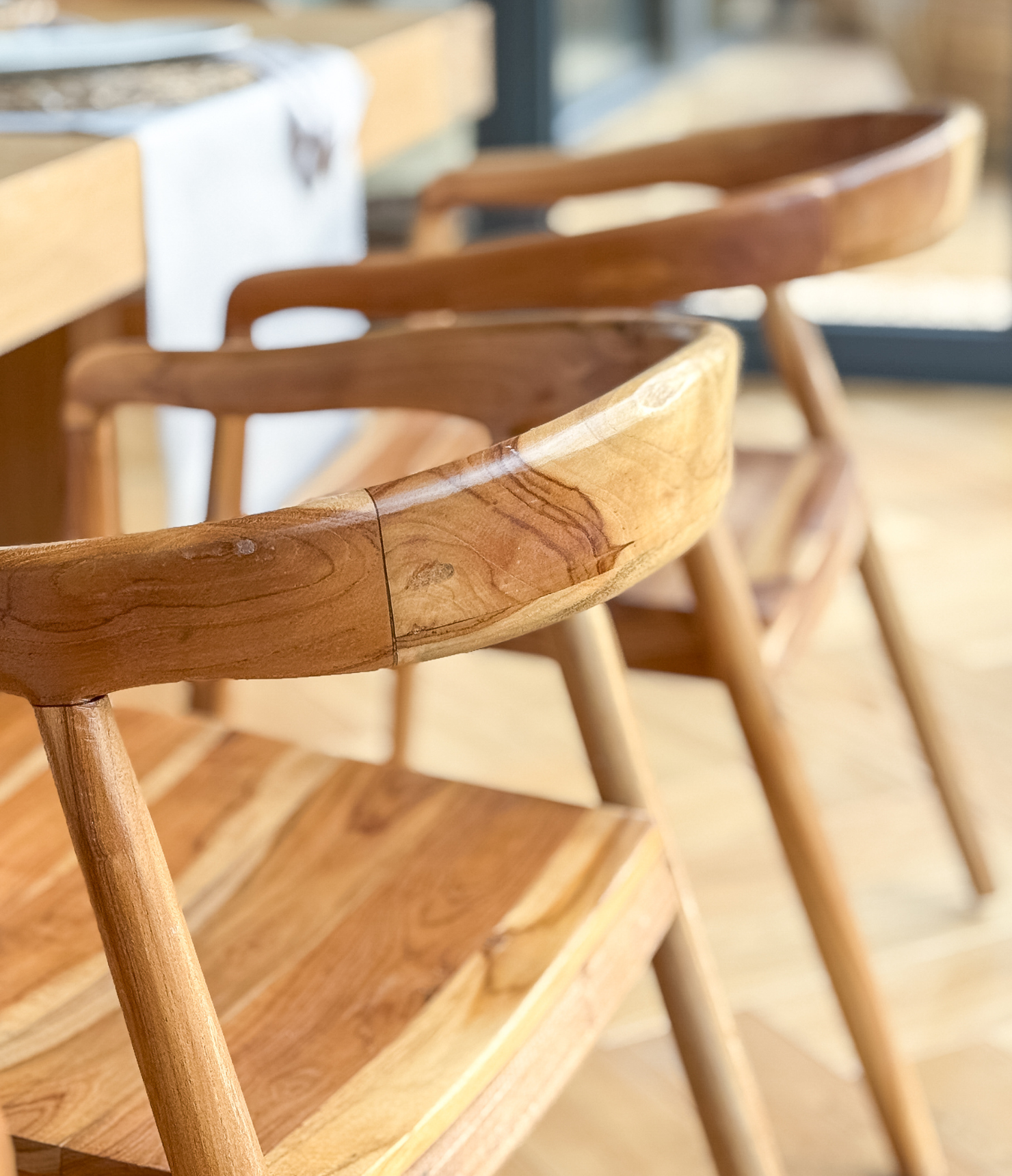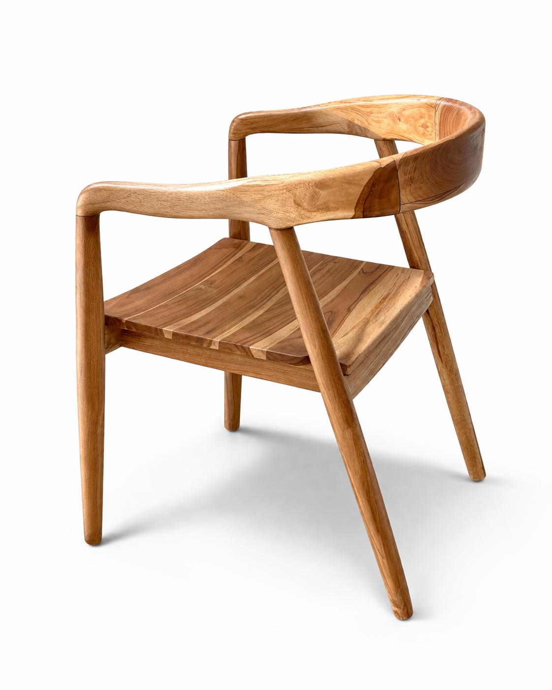 Oparcie i podłokietniki płynnie przechodzą w nogi, tworząc miękką, organiczną linię. Drewno nie zostało nadmiernie ujarzmione — zachowało naturalny rysunek słojów, subtelne nieregularności i delikatne różnice w tonacji. To właśnie one sprawiają, że każde krzesło jest jedyne w swoim rodzaju. Nie ma dwóch identycznych egzemplarzy. Krzesło Ubud nie krzyczy. Ono zaprasza. Jest spokojne, ciepłe i trwałe.